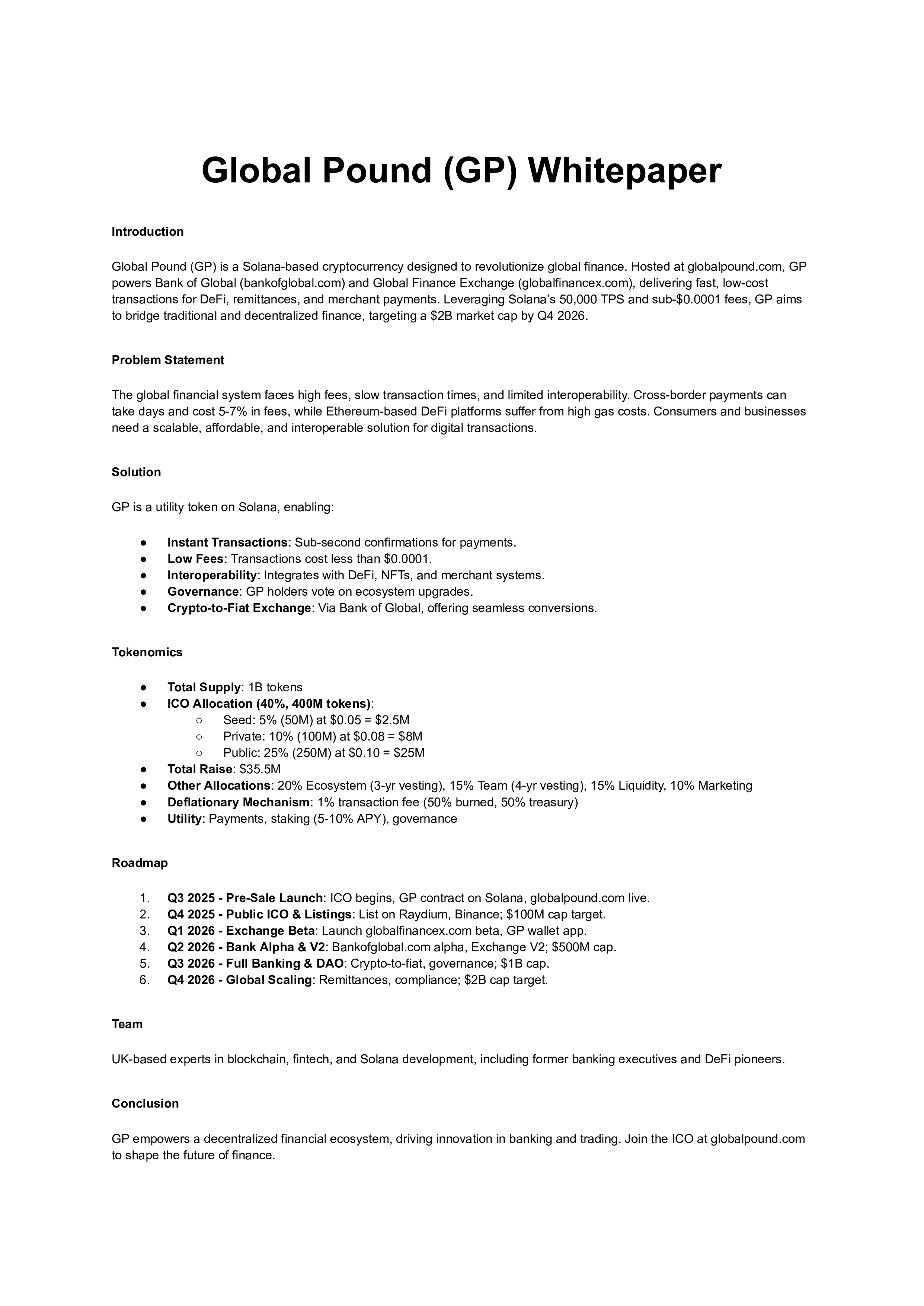 Global Pound (GP), based in the UK, is a pioneering cryptocurrency project on Solana’s blockchain, delivering instant, low-cost transactions. Our mission is to transform finance through Bank of Global and Global Finance Exchange. Led by fintech and blockchain experts, we target a $200 Billion market cap by 2026 while committing 10% of profits to end global poverty. Join our ICO at globalpound.com to shape a decentralized, equitable future.